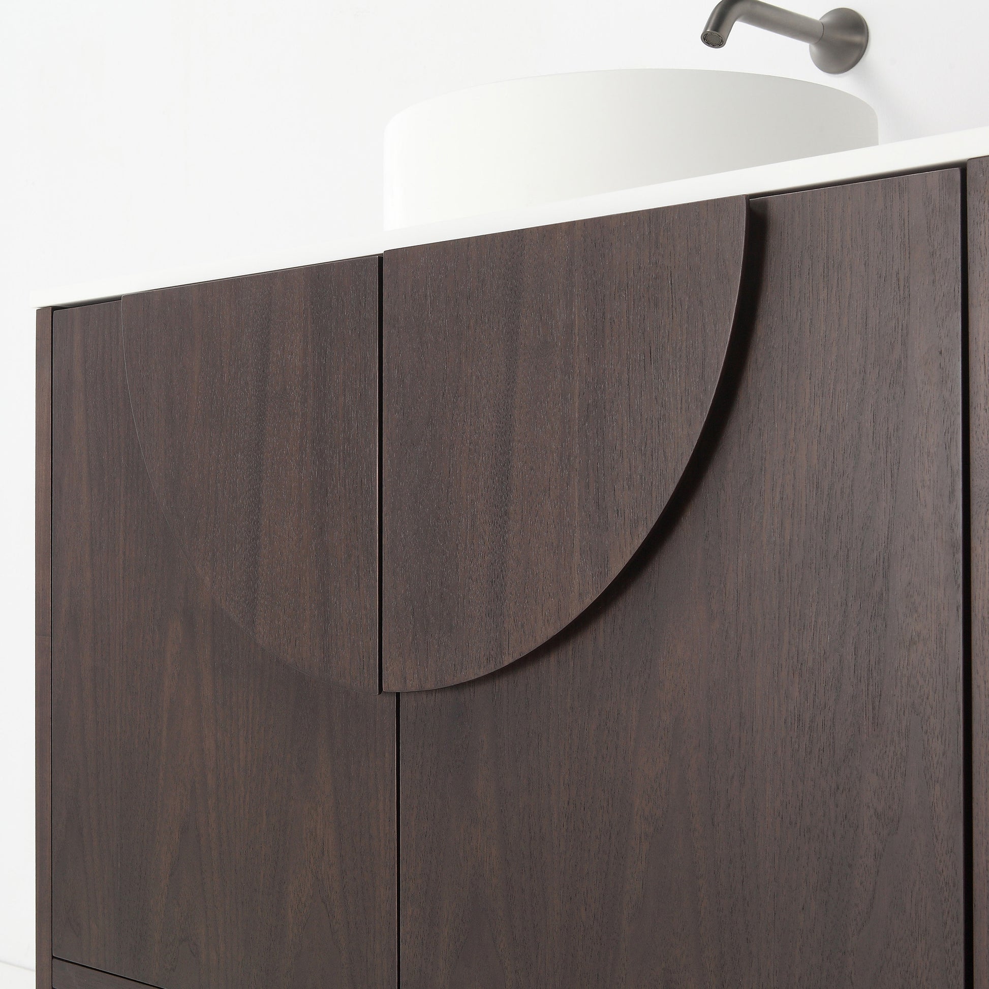 Celle 36" Freestanding Vanity brings sculptural elegance to compact spaces with its balanced blend of modern form and organic warmth. Offered in Dark Walnut for a rich, moody tone or Pecan Oak for a soft, sun-washed look, its curved detailing and clean profile elevate everyday routines with quiet design sophistication.