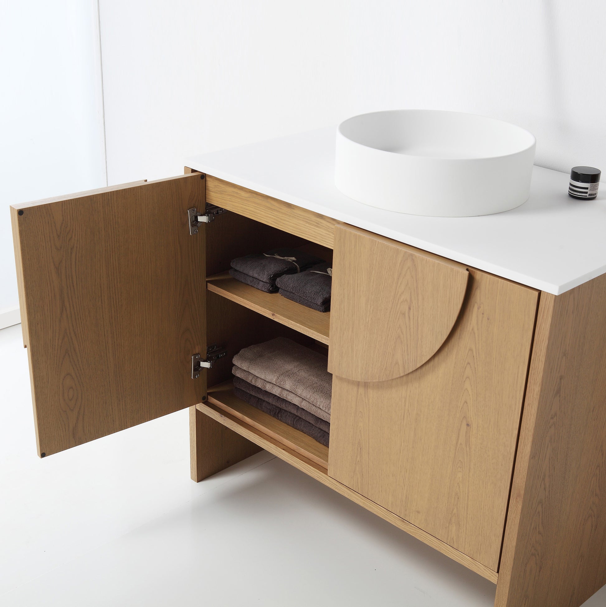 Topped with a premium matte solid surface counter and paired with a matching vessel sink, this piece makes a refined statement in powder rooms or small-scale primary baths, where every detail matters.