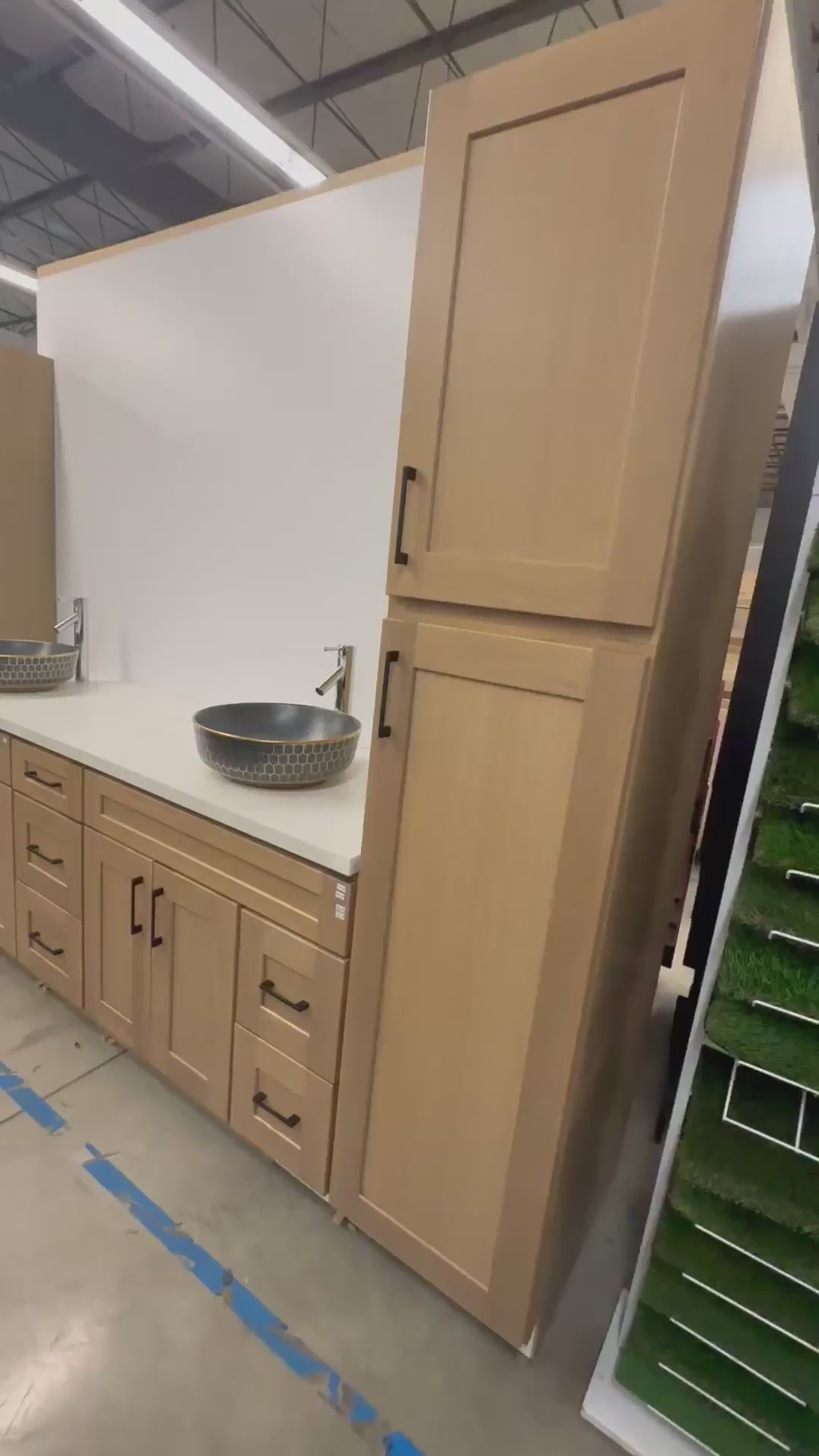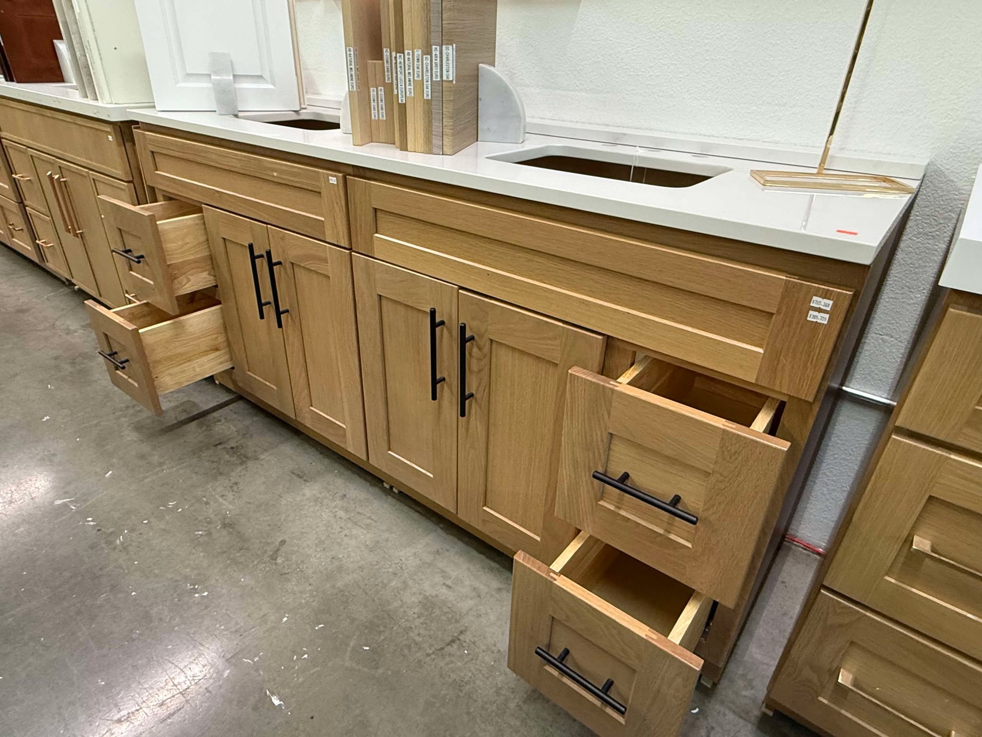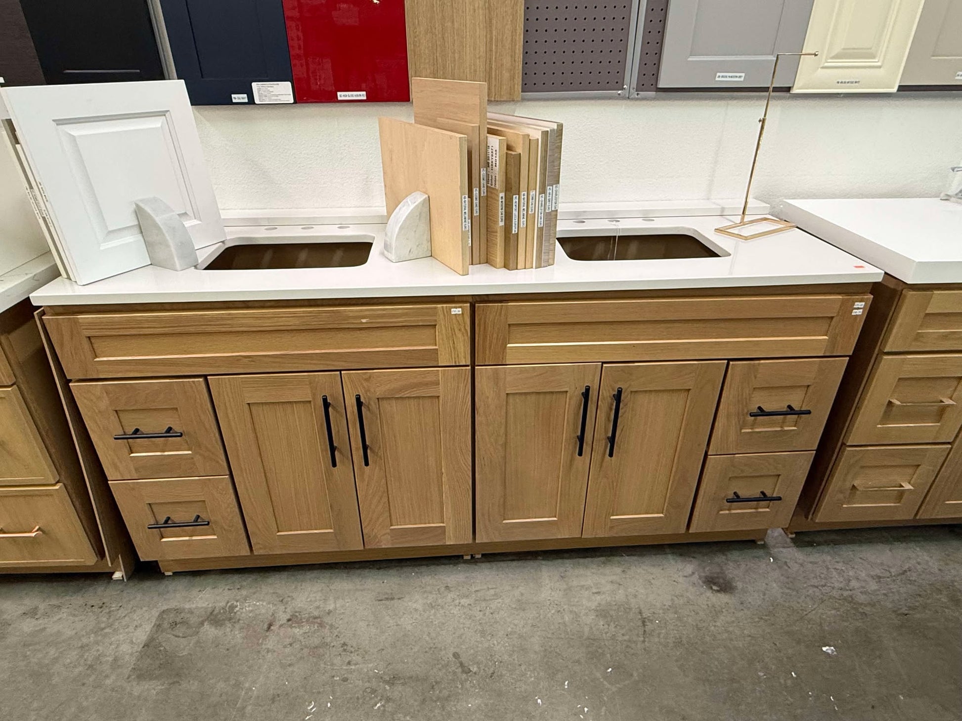 Love this vanity - it was easy to install and looks great. Slight gap in between the two cabinets, but we don't mind too much. The seamless sinks & countertop are beautiful. Drawer space isn't amazing, but the soft close features and deep cabinets make up for it